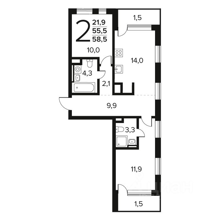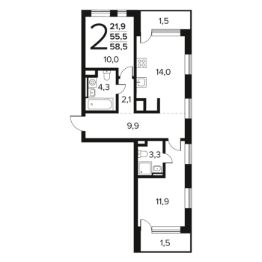 Общая площадь: 58.5 кв.м., жилая: 21.9 кв.м., площадь кухни: 14.0 кв.м. Этаж: 2.