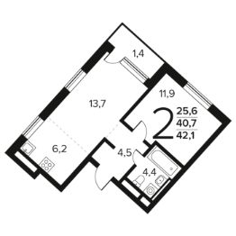Общая площадь: 42.1 кв.м., жилая: 25.6 кв.м., площадь кухни: 6.2 кв.м. Этаж: 8.