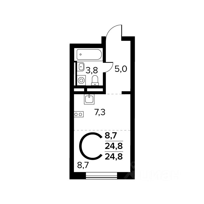 Общая площадь: 24.8 кв.м., жилая: 8.7 кв.м., площадь кухни: 7.3 кв.м. Этаж: 6.