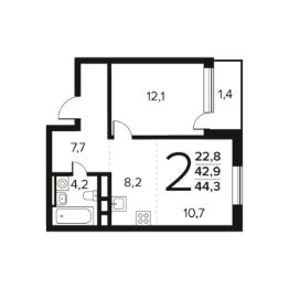 Общая площадь: 44.3 кв.м., жилая: 22.8 кв.м., площадь кухни: 8.2 кв.м. Этаж: 6.