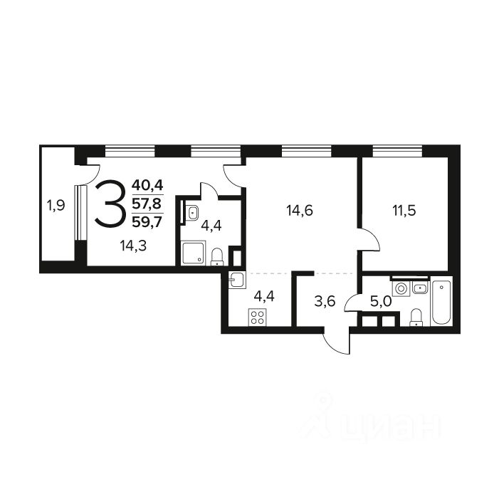Общая площадь: 59.7 кв.м., жилая: 40.4 кв.м., площадь кухни: 4.4 кв.м. Этаж: 2.