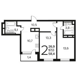 Общая площадь: 58.4 кв.м., жилая: 26.9 кв.м., площадь кухни: 10.7 кв.м. Этаж: 4.
