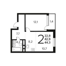 Общая площадь: 44.3 кв.м., жилая: 22.8 кв.м., площадь кухни: 8.2 кв.м. Этаж: 4.