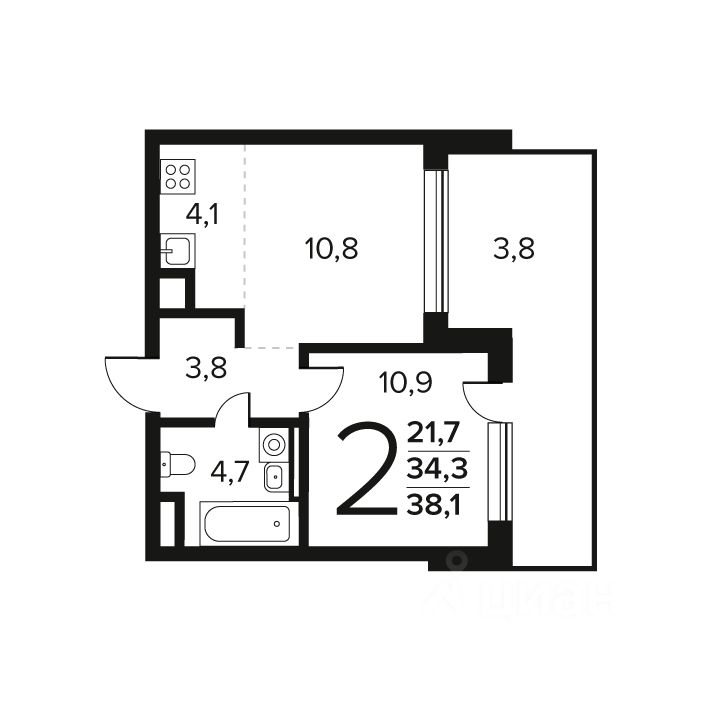 Общая площадь: 38.1 кв.м., жилая: 21.7 кв.м., площадь кухни: 4.1 кв.м. Этаж: 1.