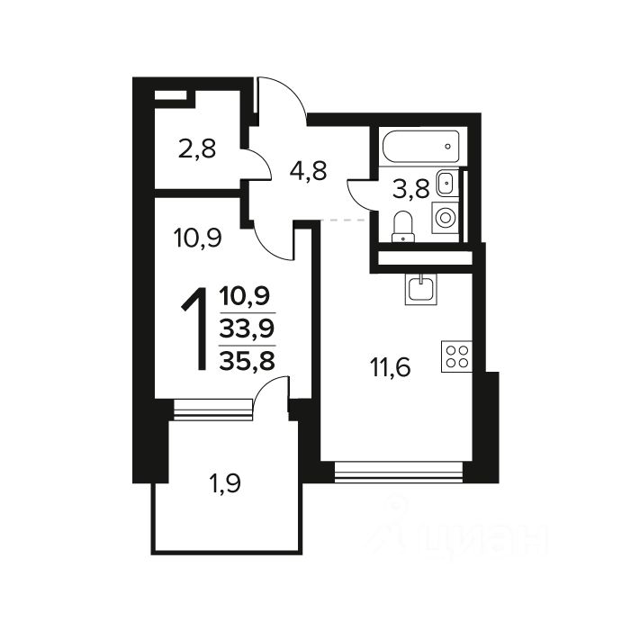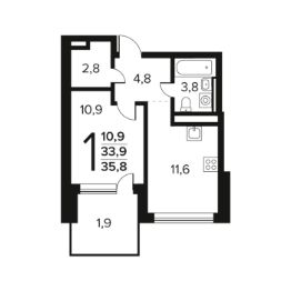 Общая площадь: 35.8 кв.м., жилая: 10.9 кв.м., площадь кухни: 11.6 кв.м. Этаж: 1.