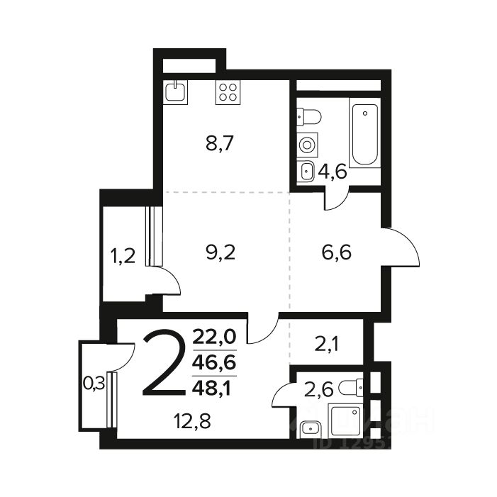 Общая площадь: 48.1 кв.м., жилая: 22.0 кв.м., площадь кухни: 8.7 кв.м. Этаж: 3.