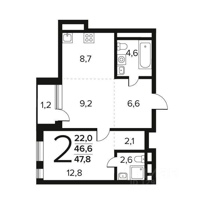 Общая площадь: 47.8 кв.м., жилая: 22.0 кв.м., площадь кухни: 8.7 кв.м. Этаж: 4.