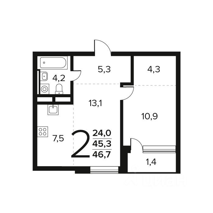 Общая площадь: 46.7 кв.м., жилая: 24.0 кв.м., площадь кухни: 7.5 кв.м. Этаж: 7.
