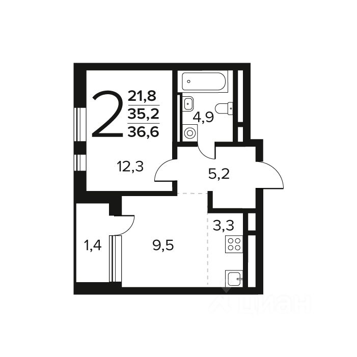 Общая площадь: 36.6 кв.м., жилая: 21.8 кв.м., площадь кухни: 3.3 кв.м. Этаж: 9.