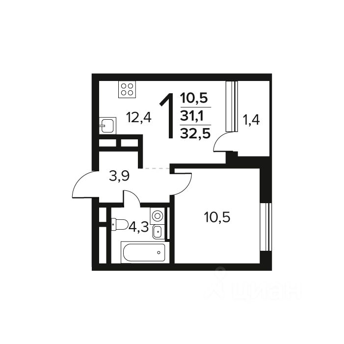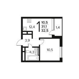 Общая площадь: 32.5 кв.м., жилая: 10.5 кв.м., площадь кухни: 12.4 кв.м. Этаж: 9.