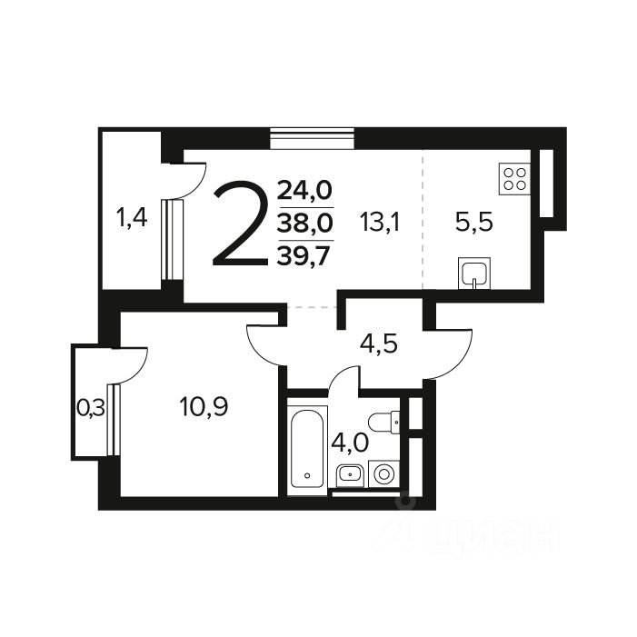 Общая площадь: 39.7 кв.м., жилая: 24.0 кв.м., площадь кухни: 5.5 кв.м. Этаж: 3.