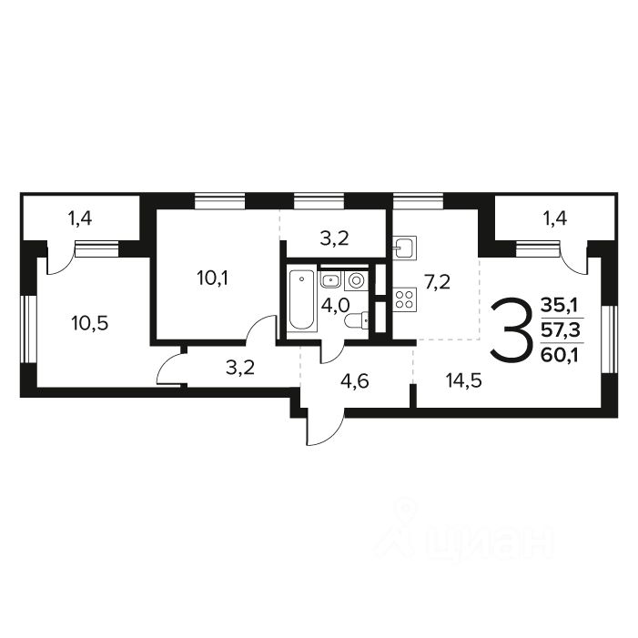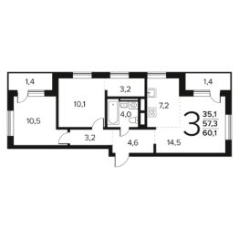 Общая площадь: 60.1 кв.м., жилая: 35.1 кв.м., площадь кухни: 7.2 кв.м. Этаж: 6.
