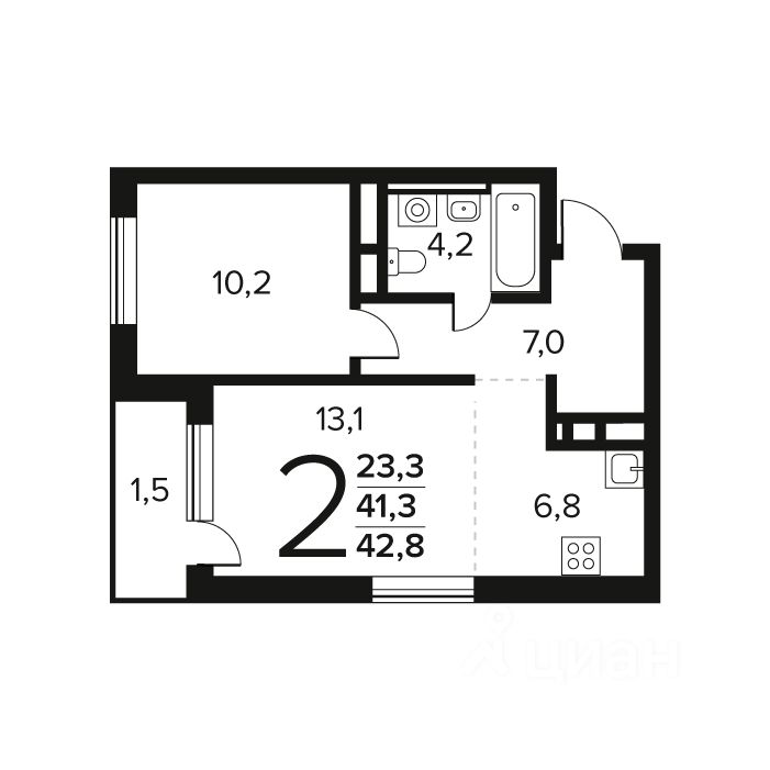 Общая площадь: 42.8 кв.м., жилая: 23.3 кв.м., площадь кухни: 6.8 кв.м. Этаж: 8.