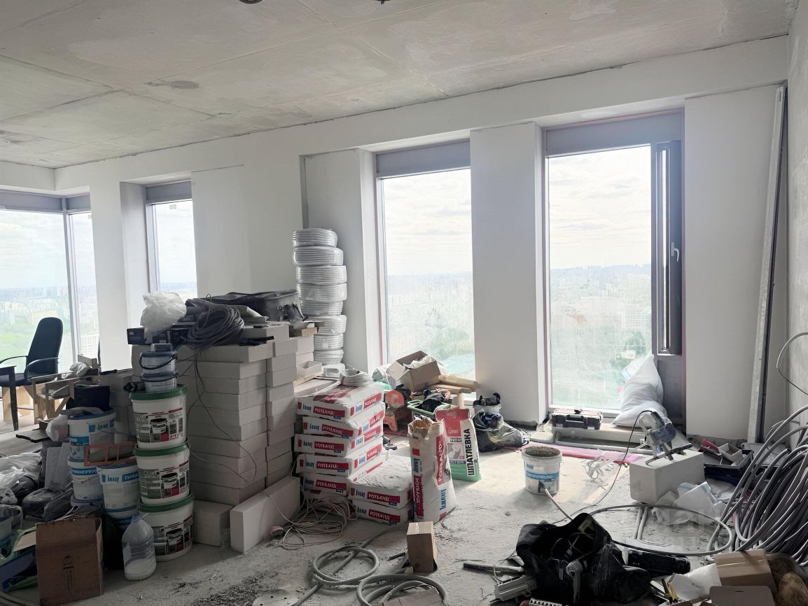 По плану : кухня - гостиная ( 58, 4м2), спальная (18,4 м2), детская (13 м2), детская (11,5 м2), спальная (16,9 м2) два сан-узла, две гардеробные, хозяйственная комната, высокие потолки, панорамные виды из окон. На этаже всего две квартиры.