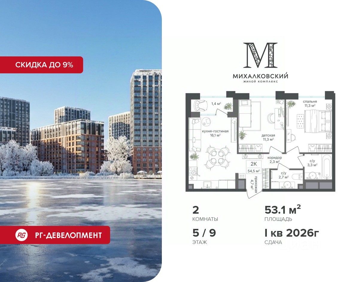 Скидка 9% при покупке квартиры! Цена указана с учетом максимального размера скидки.
