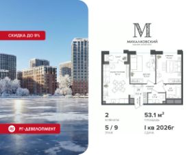 Продаётся 2-к квартира 53,1 кв.м. в ЖК "Михалковский" на 5-м этаже 9 этажного дома.