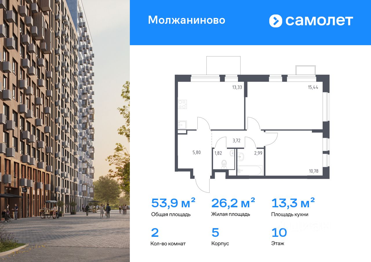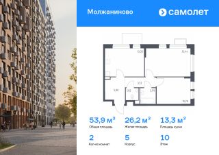 Предлагается 2-комнатная квартира комфорт-класса 53,88 кв.м в корпусе 5 на 10 этаже, в ЖК "Молжаниново"