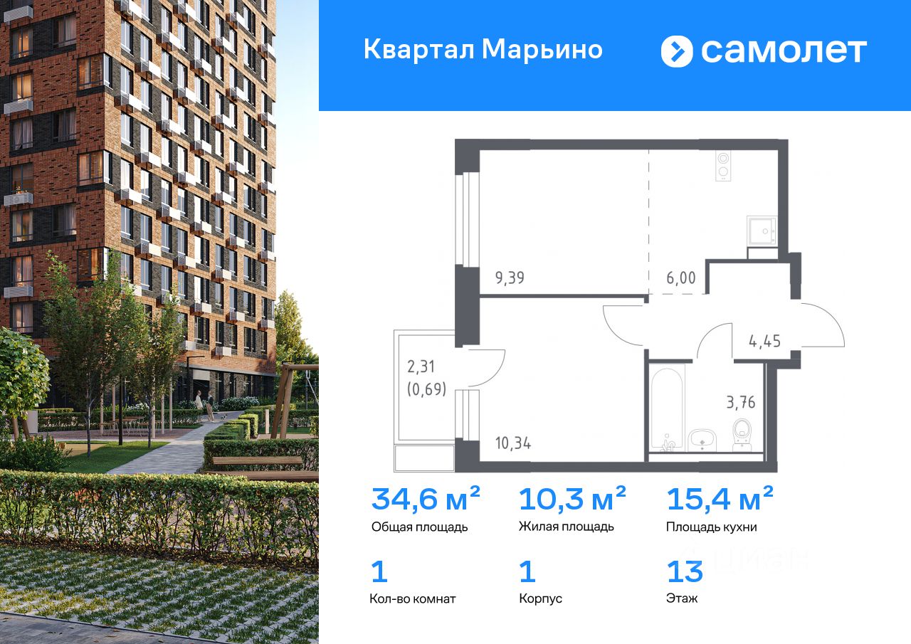 Предлагается 1-комнатная квартира комфорт-класса 34,63 кв.м в корпусе 1 на 13 этаже, в ЖК "Квартал Марьино"