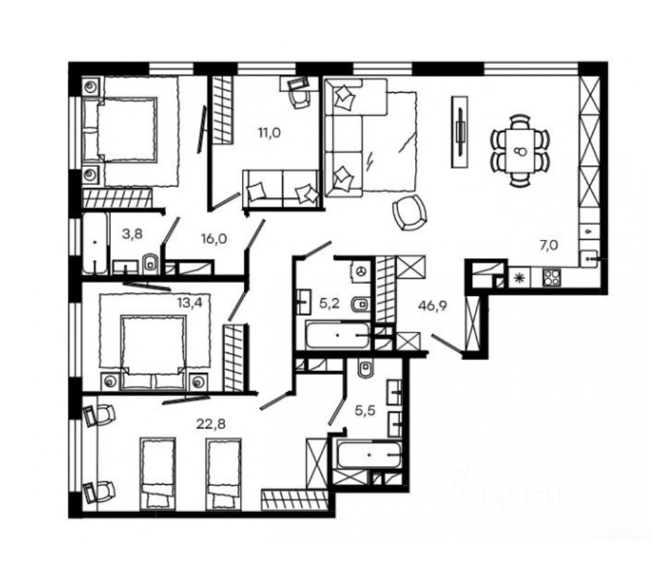 4 изолированные комнаты, просторная кухня-гостиная, 3 совмещенных с/у. Без отделки.