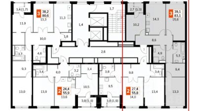 Лоджия 2,7 кв.м., гостиная-столовая 14,7 кв.м, три комнаты правильной квадратной формы - 15,6, 13,3 и 10,2 кв.м.