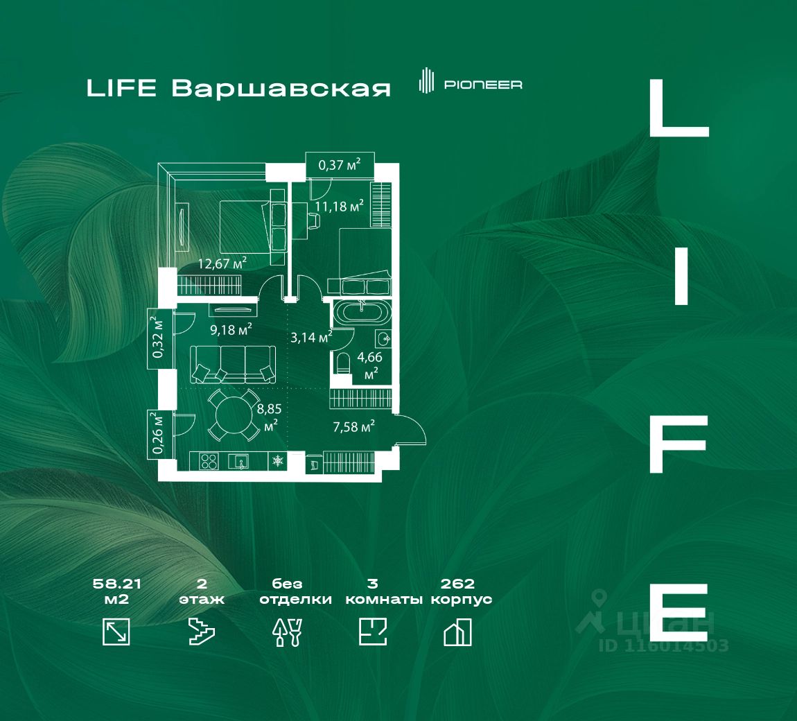 В районе Москворечье-Сабурово продается 3-комнатная квартира площадью 58.21 м². Она расположена на 2 этаже в 262 корпусе нового жилого квартала LIFE Варшавская.