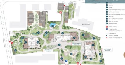 На закрытой территории находится самый большой на элитном рынке двор-парк площадью 1,4 га с фонтаном, ручьём, зонами для воркаута и тихого отдыха.