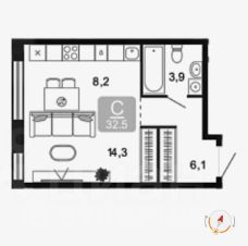 Общая площадь 32.5 кв.м., Корпус 7, Секция 7.1, Этаж 4, ИДН 360, Тип: С-4-7.1, Потолки 3.1 м., окна на юго-запад.