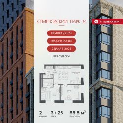 Продается 2-к квартира 55,5 кв.м. в ЖК "Семеновский парк 2" на 3-м этаже 26 этажного дома.