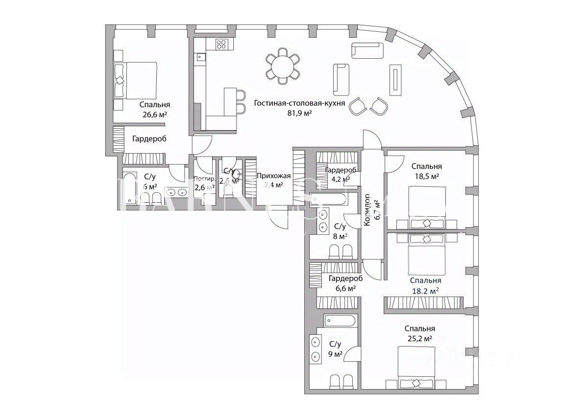 Функциональное планировочное решение: просторная гостиная с зонами столовой и кухни, 4 спальни, 4 санузла, просторные гардеробные, постирочная, прихожая с гардеробной зоной.