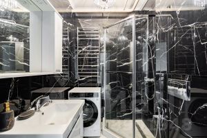 - санузел с душевой кабиной и установленной стиральной машиной.