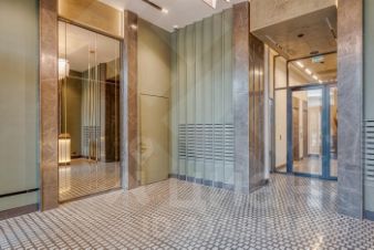 Авторский дизайн лобби в башнях от бюро OLEG KLODT ARCHITECTURE&DESIGN и Лейлы Улуханли. Дизайн центрального лобби от бюро SUNDUKOVY SISTERS.