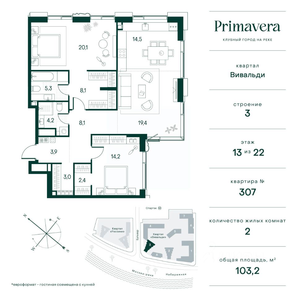Клубный город на реке Primavera — это современный жилой комплекс премиум-класса, расположенный на первой береговой линии Москвы-реки в экологически чистом районе Покровское-Стрешнево. Под панорамными окнами квартир находится собственный экопарк с продуманной сетью прогулочных дорожек и современными детскими и спортивными площадками. За парком расположена набережная с собственным пляжем и зонами для отдыха. Клубный город на реке Primavera предлагает широкий выбор планировок для различных жизненных сценариев: от просторных однокомнатных квартир до пентхаусов и жилых помещений с террасами и патио. Выберите из 120 вариантов эргономичных планировок стандартного и евроформата. Из каждой квартиры открываются красивые виды на реку с углом обзора в 270 градусов. Дизайнерские лобби предлагают панорамный обзор на благоустроенный двор. Высокие потолки в 6 метров и качественная отделка создают атмосферу, схожую с пятизвездочными отелями. В Primavera есть всё необходимое для комфортной жизни в мегаполисе: • Образование для детей в шаговой доступности: 4 школы, 8 детских садов и развивающие центры с кружками и секциями. • Удобства на расстоянии приятной прогулки: супермаркеты, кафе, рестораны с верандами, салоны красоты, аптеки и многофункциональный центр для шоппинга и развлечений. • Умный дом: автоматизированное бесконтактное управление основными системами доступа и безопасности через мобильное приложение. Клубный город на реке Primavera выгодно сочетает комфорт городской жизни с близостью к природе. Живите в месте, где все создано для вашего удобства!