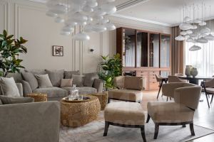 Планировочное решение: кухня с обеденной зоной и гостиной, мастер-спальня со своим санузлом и гардеробом, две изолированные спальни, гостевой санузел, постирочная, гардеробная комната при входе.
