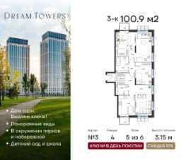 Общая площадь: 100.9 кв.м. Высота потолков от 3.15 м.