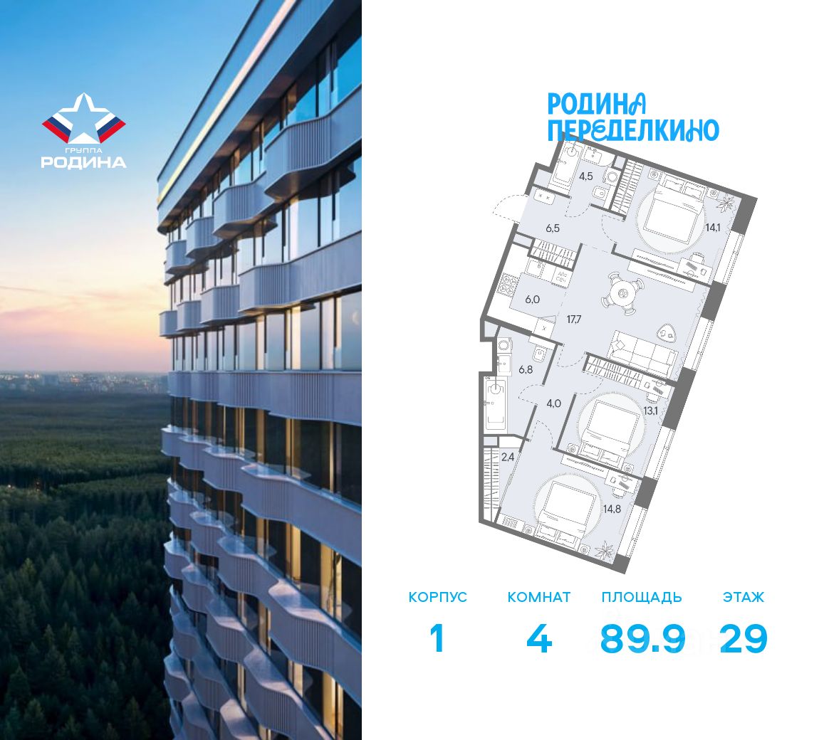 Продаётся 4-комнатная квартира площадью 89.9 м² на 29 этаже в Жилом Комплексе "Родина Переделкино".