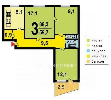 Продаю уютную 3-комнатную квартиру. Общая площадь: 60 кв.м., комнаты: 17 + 12 + 9 кв.м. (с учeтoм лoджии, площадь coставляет 65 кв. м.)