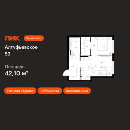 Продаётся 1-комн. квартира площадью 42,1 кв.м на 21 этаже 22 этажного дома (Корпус 1.1, Секция 1) проекта ПИК Алтуфьевское 53. Светлый просторный подъезд на уровне земли, функциональная планировка, большие окна, c отделкой.