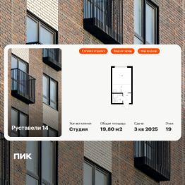 Продаётся квартира-студия площадью 19,8 кв.м на 19 этаже 33 этажного дома (Корпус 2.5, Секция 1) проекта ПИК Руставели 14. Светлый просторный подъезд на уровне земли, функциональная планировка, большие окна, c отделкой.