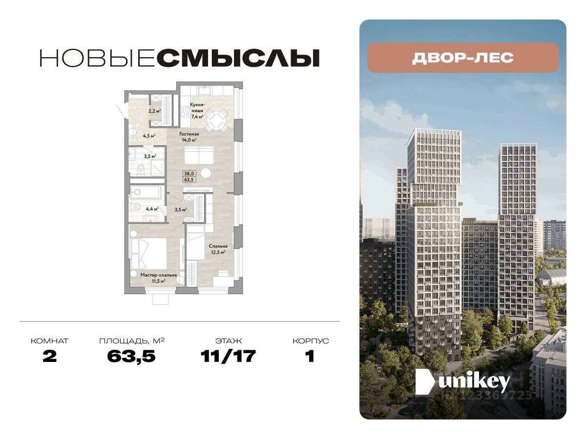 В жилом комплексе, расположенном по соседству с ландшафтным парком "Южное Бутово", продается 2-комнатная квартира площадью 63.50 кв. м. с отделкой. Квартира расположена на 11 этаже 1 корпуса в жилом квартале комфорт-класса "Новые Смыслы" (ГК Unikey/Юникей).