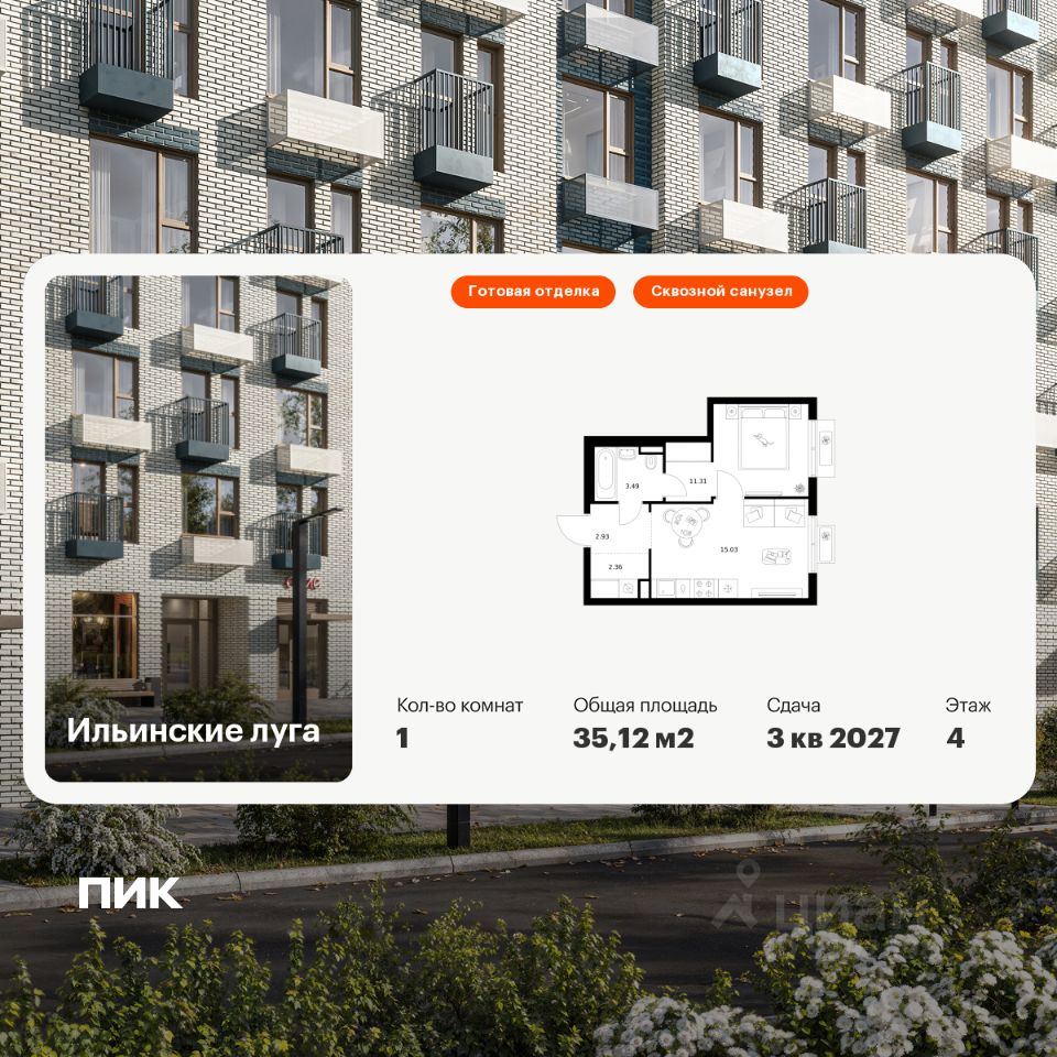 Продаётся 1-комн. квартира площадью 35,12 кв.м на 4 этаже 9 этажного дома (Корпус 4.1, Секция 2) проекта ПИК Ильинские луга. Светлый просторный подъезд на уровне земли, функциональная планировка, большие окна, c отделкой.