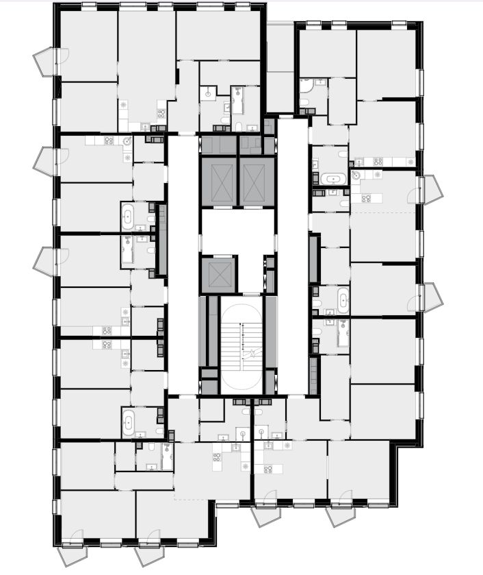 • Трехуровневая структура, где на верхнем ярусе вы увидите геометрические эркеры с панорамным остеклением, на среднем уровне расположены квартиры с окнами на 1-2 стороны, а на нижнем отделка австрийским клинкерным кирпичом.