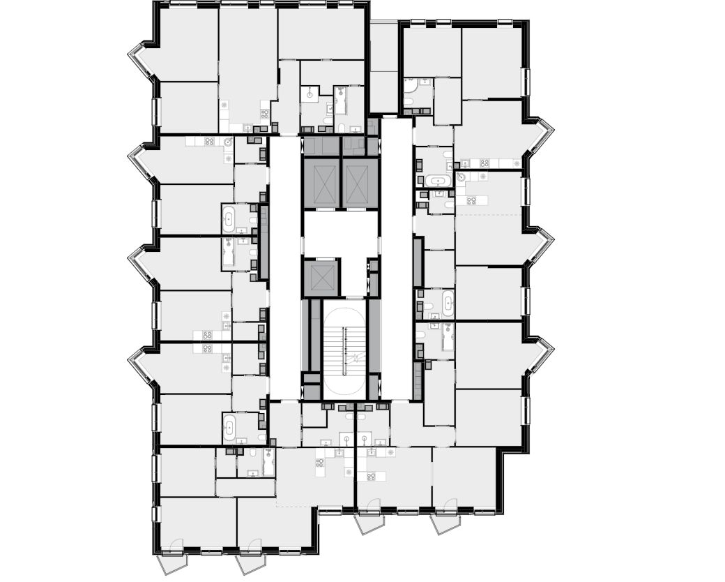 • Трехуровневая структура, где на верхнем ярусе вы увидите геометрические эркеры с панорамным остеклением, на среднем уровне расположены квартиры с окнами на 1-2 стороны, а на нижнем отделка австрийским клинкерным кирпичом.