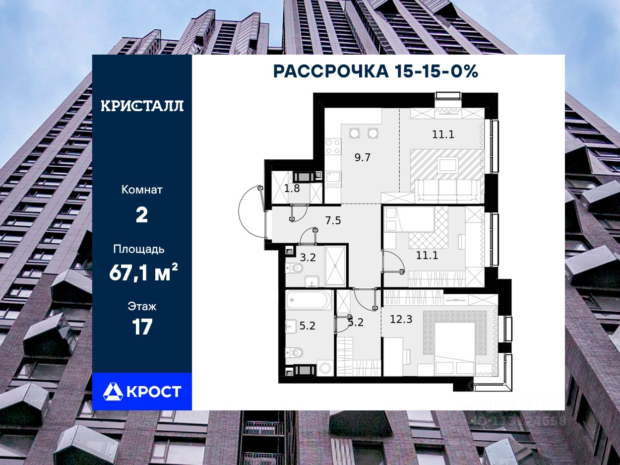 Двухкомнатная квартира площадью 67,1 кв.м. на 17 этаже дома бизнес-класса "Трилогия Кристалл".