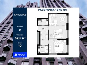 Двухкомнатная квартира площадью 52,5 кв.м. на 10 этаже дома бизнес-класса "Трилогия Кристалл".