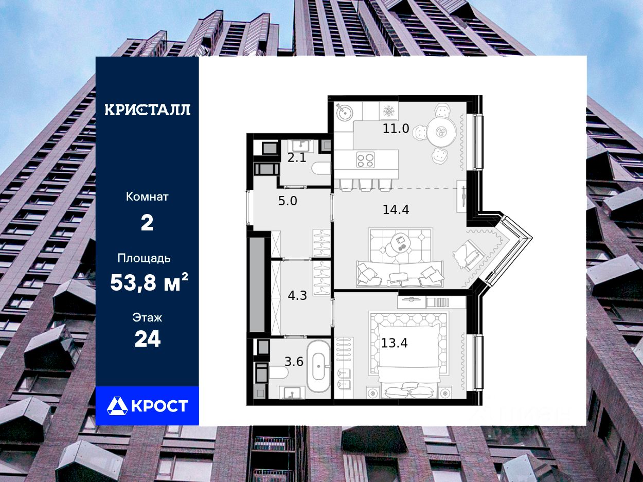 Двухкомнатная квартира площадью 53,8 кв.м. на 24 этаже дома бизнес-класса "Трилогия Кристалл".