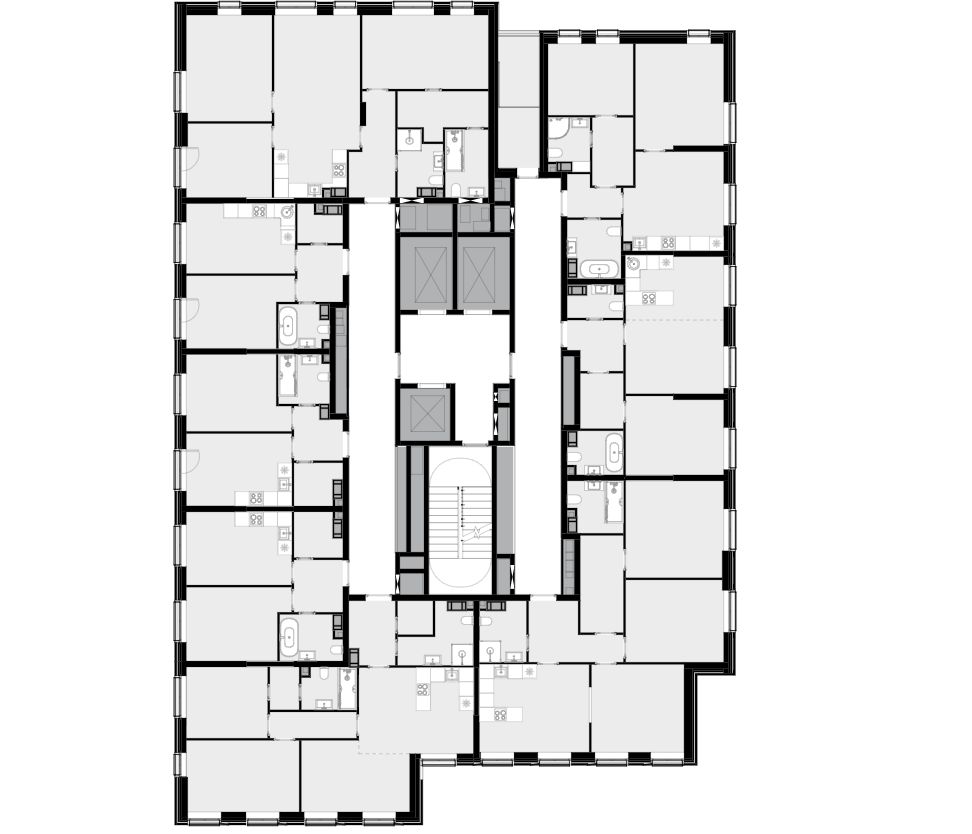• Трехуровневая структура, где на верхнем ярусе вы увидите геометрические эркеры с панорамным остеклением, на среднем уровне расположены квартиры с окнами на 1-2 стороны, а на нижнем отделка австрийским клинкерным кирпичом.