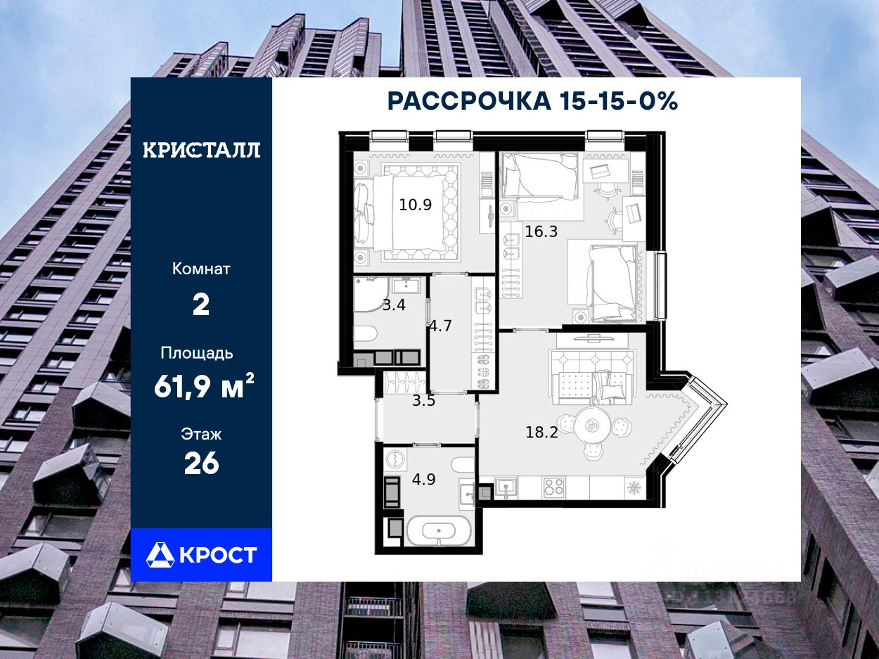Двухкомнатная квартира площадью 61,9 кв.м. на 26 этаже дома бизнес-класса "Трилогия Кристалл".