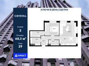 Однокомнатная квартира площадью 68,3 кв.м. на 29 этаже дома бизнес-класса "CRYSTAL Трилогия".