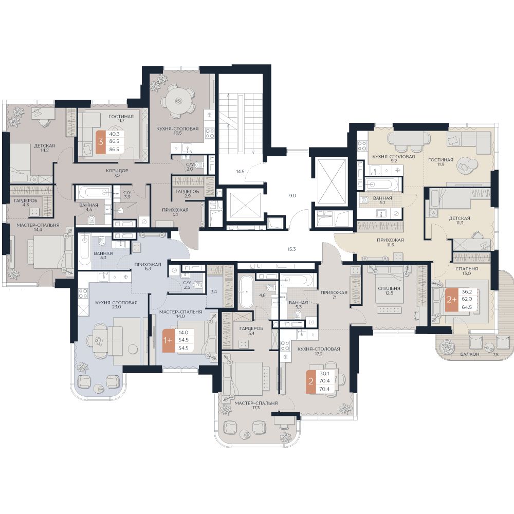 Разнесенные по разным сторонам квартиры мастер-спальня и комната помогут сохранить личное пространство или разделить квартиру на удобные зоны.