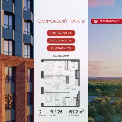 Продается 2-к квартира 61,2 кв.м. в ЖК "Семеновский парк 2" на 9-м этаже 26 этажного дома.